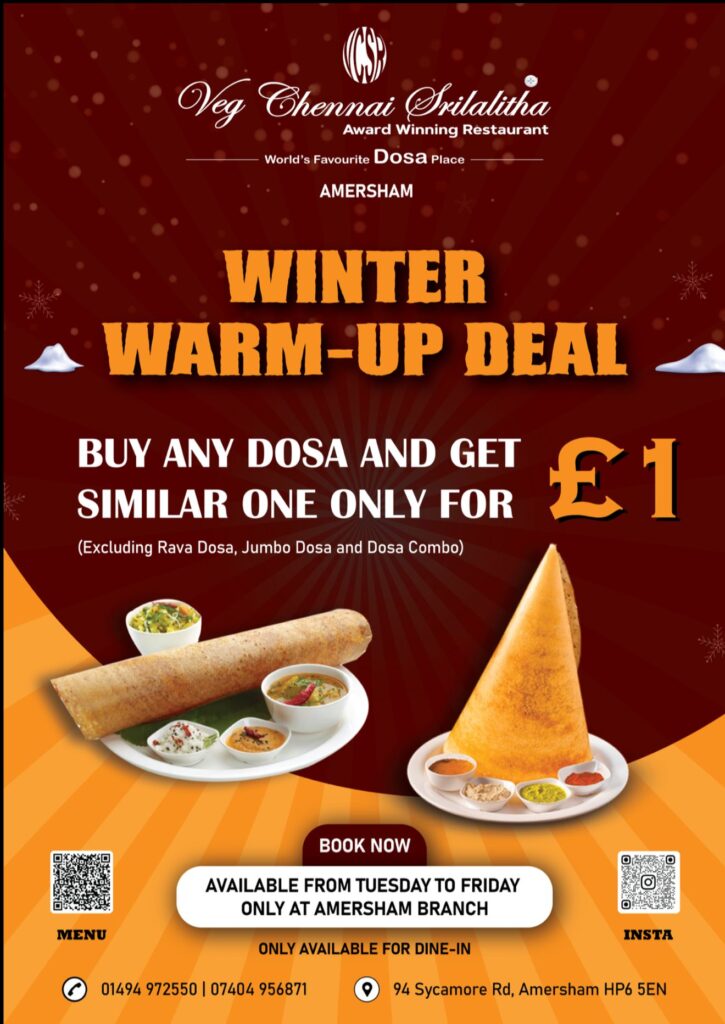 As a South Indian restaurant serving fully 100% vegetarian dishes, we specialise in crispy dosas, aromatic sambars, traditional idlis, and wholesome South Indian vegetarian dishes prepared with fresh ingredients and family recipes. We also offer flavourful South and North Indian Thali’s for those who want a complete meal experience. Known as one of the top-rated Indian veg restaurants near me in Amersham, our dining space is warm, welcoming, and perfect for all ages, making it a genuinely family-friendly Indian vegetarian restaurant. Whether you’re craving the best dosa restaurant in Amersham or looking for 100% pure vegetarian catering services for events, we bring quality, purity, and tradition to every plate—right here in the heart of Amersham.
